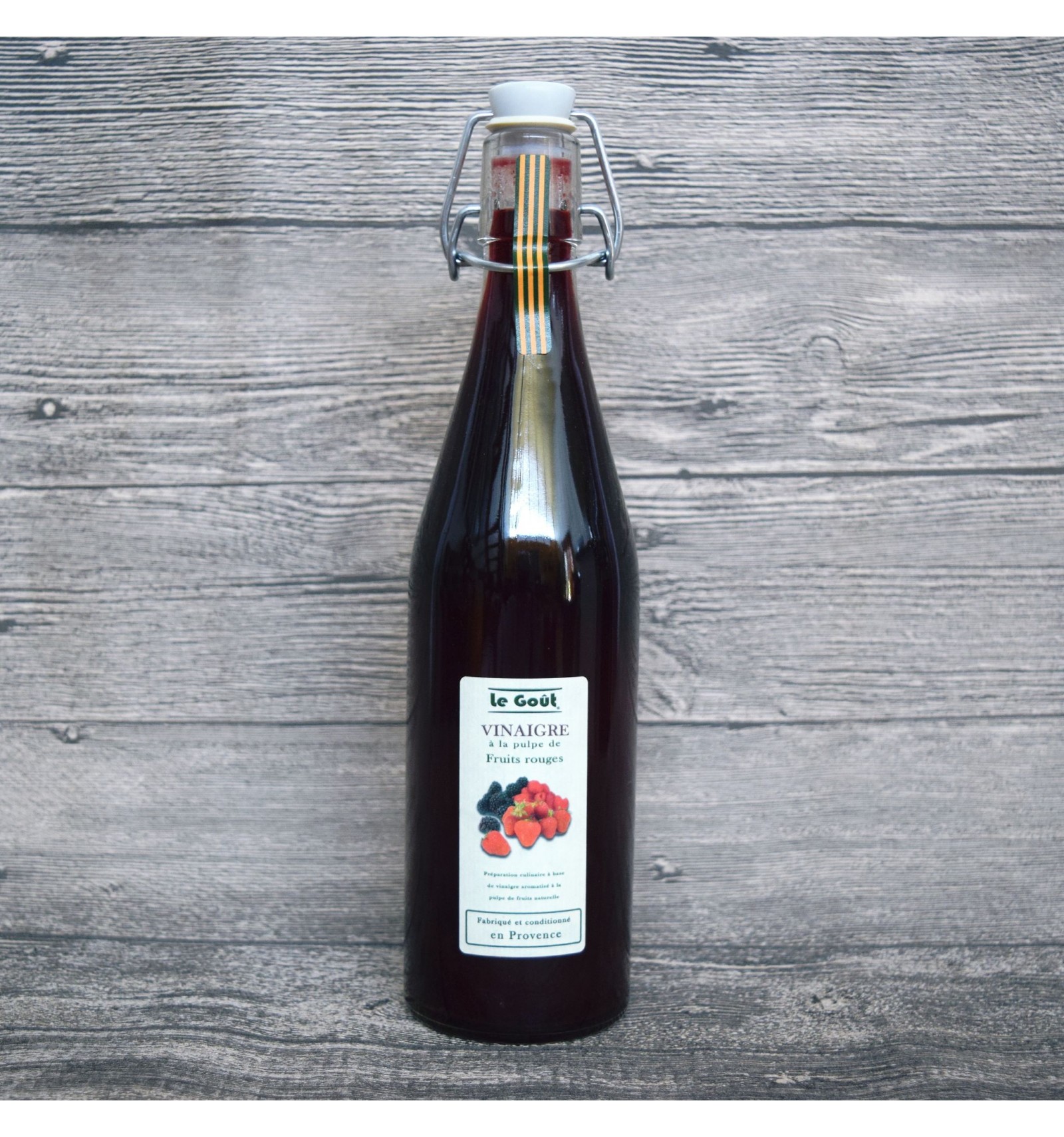 Ingrédients: vinaigre cristal 8°, pulpe de framboise 11%, pulpe de mure 11%, pulpe de cassis 10%, pulpe de fraise 10%, sucre.